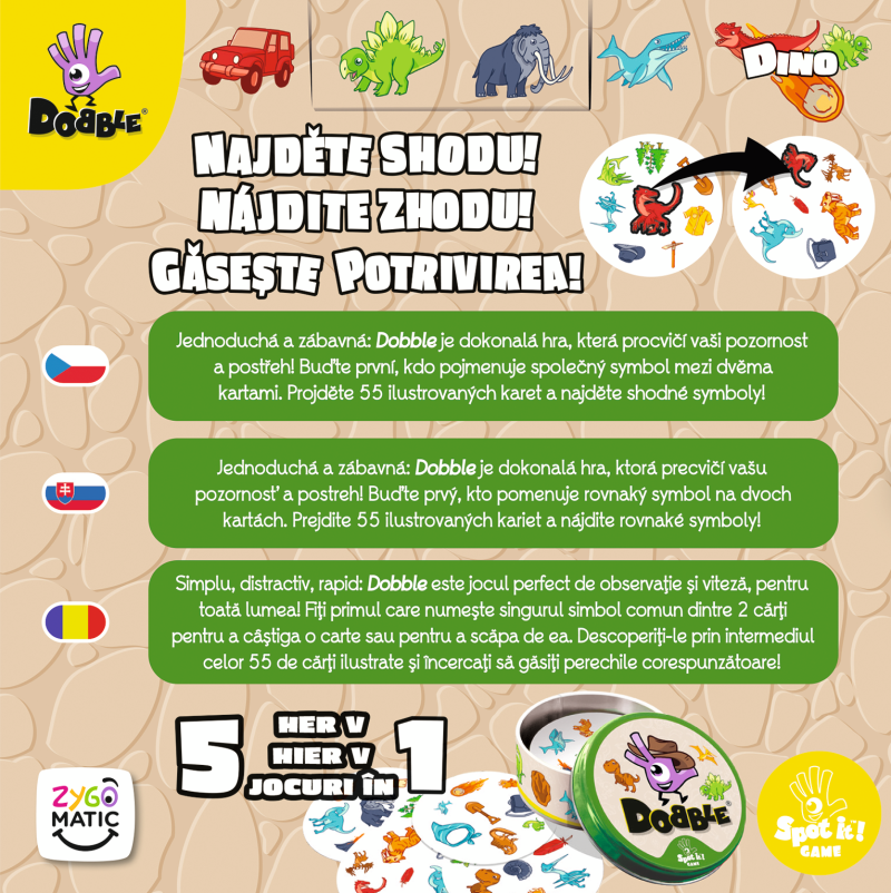 Rychlost, postřeh, reflexy! Dobble Dino, to je 57 různých symbolů, 55 karet, 8 obrázků na kartě a každé dvě karty spolu mají společný jen jeden obrázek!_x000D_ _x000D_ Hra je kompletně v češtině i slovenštině a nabízí zcela unikátní zábavu. Děti zde hledají dva stejné obrázky na kartách při různých verzích hry (v pravidlech je popsáno celkem 5 her). Super jsou kulaté karty i jednoduchá pravidla vysvětlená doslova za pár sekund. Hra je určená především pro děti, ale i jejich rodiče – zkrátka pro všechny, kteří se chtějí pořádně bavit a nemají čas pročítat dlouhá pravidla. Plechová krabička zaručuje bezpečí karet a jednoduše umožňuje mít hru vždy u sebe. Vyzkoušejte i Vy postřehový fenomén Dobble a jistě budete překvapeni, jak i tak jednoduchá hra může být zábavná!_x000D_ _x000D_ Obsah balení: _x000D_ 55 karet v plechové krabičce_x000D_ 1 česká, slovenská a rumunská pravidla_x000D_